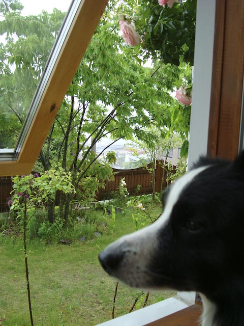 ちょっと早いナニワイバラが終わって、いよいよ本格的なバラのシーズンが到来か? というのに最近は雨つづき… まあ、雨にやられる前に記念写真ということで、ガスを前に座らせて一枚。 これは丈夫で手のかからないピエール君(ピエール-ド-ロンサール) パーゴラを登らせているのはランブリング・レクター 他にもブドウやらクレマチスやらがシナノキにからんでジャングル状態に… ブドウの葉影につぼみ?発見、 「シャトー・ガスパール」が飲めるのはいつの日か?