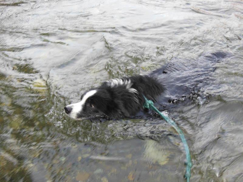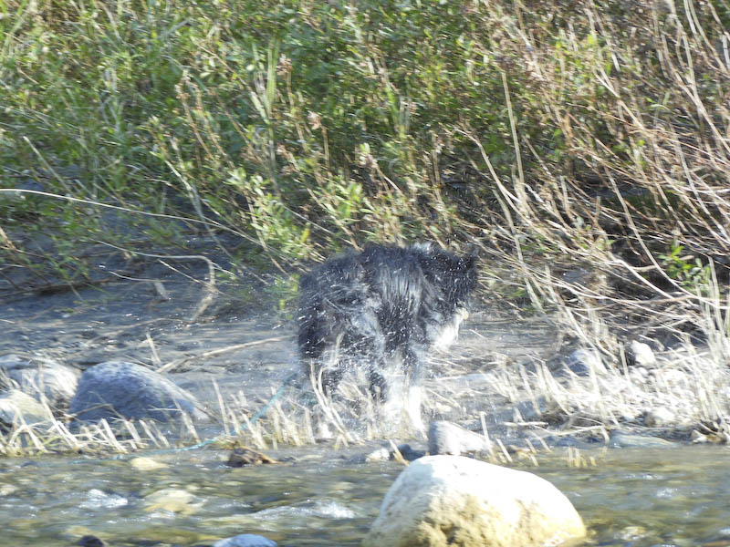 土曜日は、梅雨の晴れ間の日本晴れ! こんな日は掃除、洗濯を先送りして河原へGO! 今年こそは「水嫌い」を克服してカッパ犬を目指すぞ! 泳いでます! 泳いでます! 必死です! 「獅子の子を谷に突き落とす気持ちで、渕のほうに追いやりました。」 とはガスパパの弁。 目を離した隙に岸に上がってブルブルッ、 そして砂の上でゴロンゴロン… ネコ灰だらけ、ならぬガス砂だらけに… ドロ〜ン(飼い主の落胆する音) 年老い「ましら」となった猿は その毛に砂をまぶし付け、鉄砲の弾をもはじく鎧となす… 一瞬、ガスパパの脳裏を忍者小説の一節がよぎる。 いや、帰ったらシャンプー決定だ。 とりあえず砂を落として記念写真。 久しぶりに泳いで疲れたのか、 はたまた帰ってからのシャンプーが気にかかるのか、 ガスはちょっとダウン気味の表情 まるで「あおもり犬」みたい?