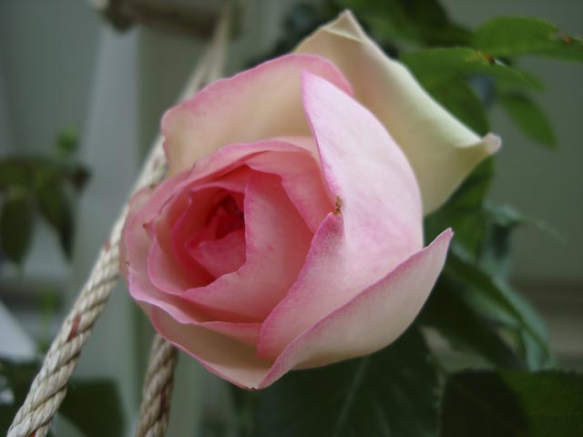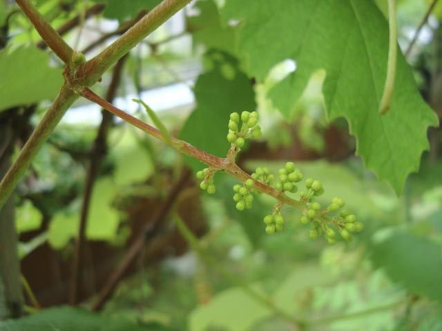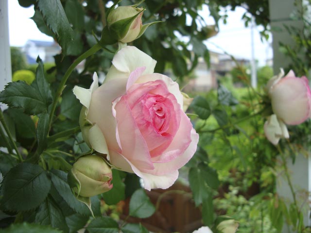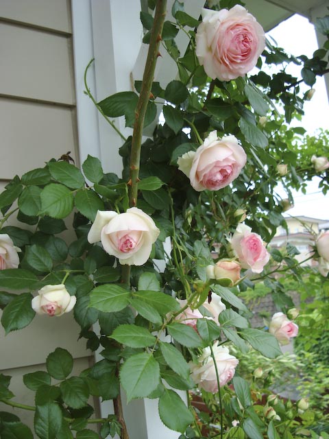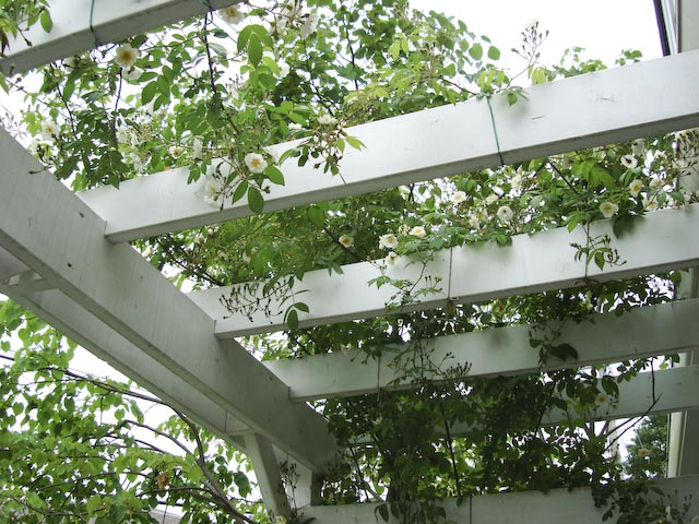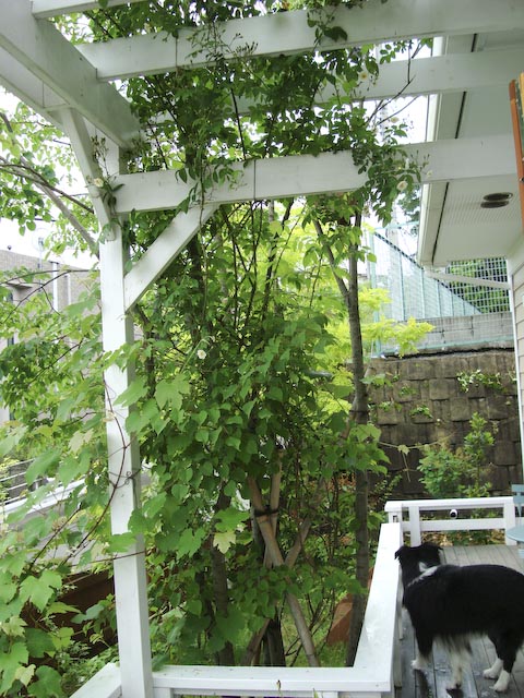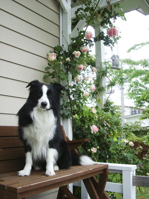 ちょっと早いナニワイバラが終わって、いよいよ本格的なバラのシーズンが到来か? というのに最近は雨つづき… まあ、雨にやられる前に記念写真ということで、ガスを前に座らせて一枚。 これは丈夫で手のかからないピエール君(ピエール-ド-ロンサール) パーゴラを登らせているのはランブリング・レクター 他にもブドウやらクレマチスやらがシナノキにからんでジャングル状態に… ブドウの葉影につぼみ?発見、 「シャトー・ガスパール」が飲めるのはいつの日か?