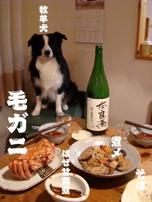 みなさま、明けましておめでとうございます。 今年も「Go Go ガスパール!」をよろしくお願いします! 上の写真は我が家の年賀状です、蔵王の牧場に行って牛との2ショット写真でも撮ってこようか、とも思いましたが、慌ただしい年末にそんな暇はとれず、結局夏に行った那須の南ヶ丘牧場の牛と合成しました。(暑い日だったのでベロ長過ぎ…) 昨日は大崎八幡宮に初詣、 最近はボーダーの知名度も上がっているようで 「あ〜、ボーダーコリーだ〜!!」 と見知らぬ人からたくさん声を掛けてもらって ガスも飼い主も上機嫌。 小さい子を連れたお母さんに 「おりこうさんな犬なんだよ〜」 なんて言われると、 「いや〜、どうでしょうかね〜」 と答えつつ心の中では 「そうそう、君位の知能はあるかな。」なんて思ってたりして。 今年も親バカ全開 ここで、 「酒とガスパール」新春特別号 我が家の年越しメニュー大公開! ことしのポイントは毛ガニです!それも一人に一匹!まさに一局集中! それに合わせるのが「奈良萬 純米吟醸 無濾過生原酒 中垂れ」日本酒ファンにとって「生酒」が飲める嬉しいこの季節。さらに「中垂れ」まさに蔵に行かなきゃ飲めない味。 フルーティでありながらもしっかりした輪郭をもち、生酒の証の微発泡も心地よい。 毛ガニの味噌を肴に… 堪らないね。 (えっ、蔵になんて行ってないけど…)ガスパマ^_^;