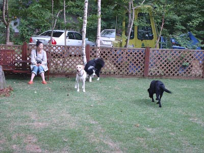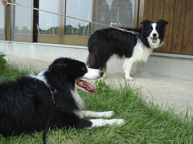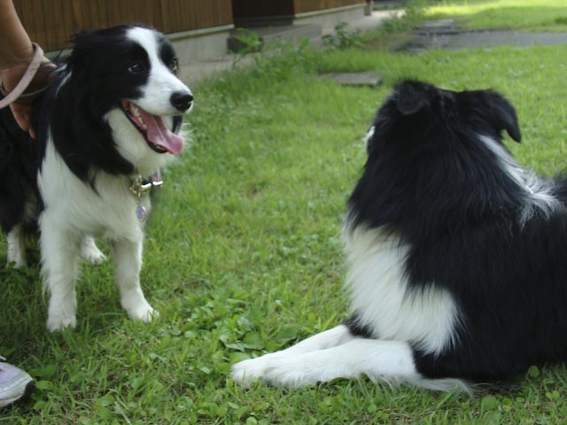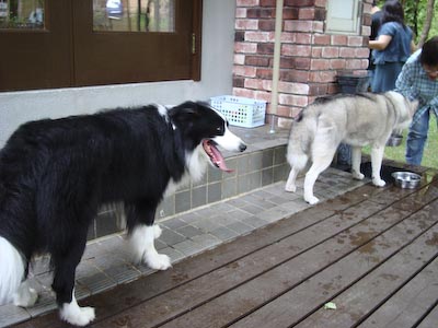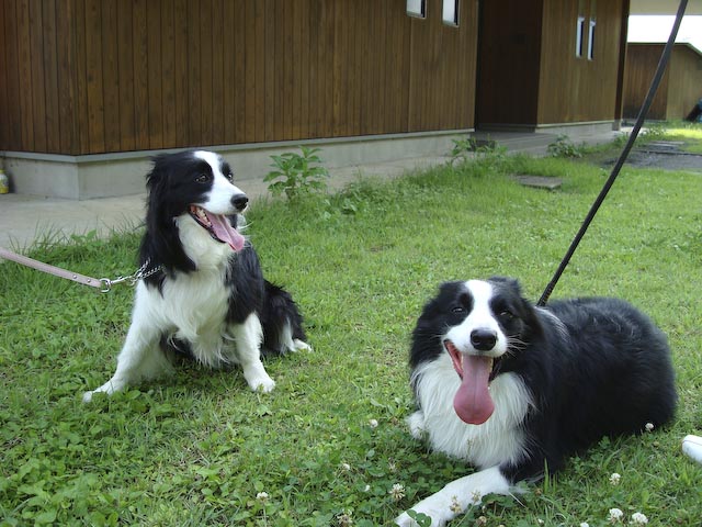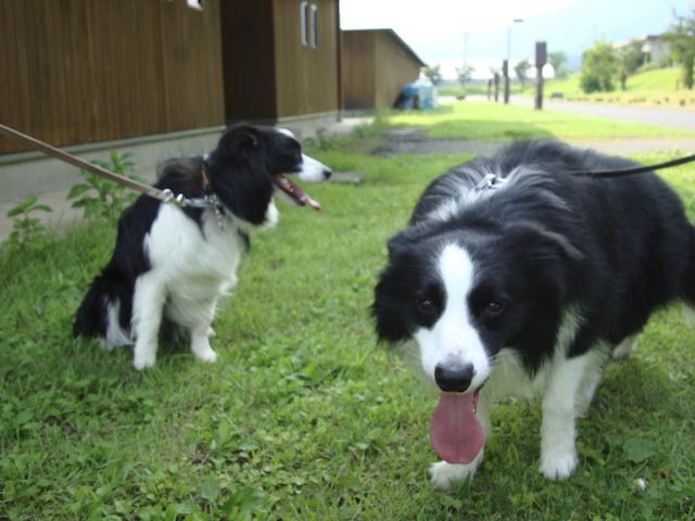 夏休み第2弾の旅♪またまた去年も行った那須高原です。 前とおんなじ山のログハウスを借りました♪ タイコウチ家が一緒なのも去年とおんなじ。 大人4人、中学生1人、ワンコ一匹の旅の一行です。 今年の1日目のメインイベントは ちょっと那須から足を延ばして「ボーダーコリー マリンと一緒」の ブログでおなじみの「マリンちゃん」に会いに行くことです!!たのしみ~♪♪ 今回はお天気にも恵まれて、何の心配もない、よいお天気♪ 高速道路を走りながら、はみぃさんとメールのやり取りをして、心ウキウキです♪ はみぃさんのブログでよく見かけていた「ろまんちっく村」で待ち合わせることに… 芝生で待ち合わせって^^;すごーく広いんですけど~ あちこちうろうろして、やーっと、会えましたぁ!! はみぃさん、マリンちゃん、暑いところお待たせしてごめんなさい。 「マリンです、はじめまして…」 「……!!」 「でへへへ~、超かわいい~」 もう、すぐにガスパールはデレデレです。(^_^;) でも、なんかこのふたりよく似てるんですよね、お顔の白黒のバランスとかが… マリンちゃんは、女の子っぽく小柄でキュート。 ガスパールがちょっと、大イヌに見えます^^; 「マリンちゃん、僕ガスパールっていいます。これから仲良くしてね♪」 「ちょっと、よく考えさせてください…」 マリンちゃん、今回は実際に会うことができて、とてもうれしかったです。 ガスパールがちょっと、しつこくてごめんなさいね(^^ゞ はみぃさん、暑いところ、わざわざ会いに来てくれてありがとうございました。 もうちょっと、涼しかったら、一緒に走って遊びたかったですね。 あんまり、ちょくちょくは行けないけれど、またブログでよろしくお願いします♪ 心温まるふたワンコの出会いのあとに、おまけ画像… 夜のログハウスでバーベキューをしているところに現れた怪獣?! 「きらーん!!」 二日目につづく… (週1回ペース更新の目標は果たせませんでした^^;月1回って感じですかねー)