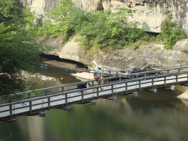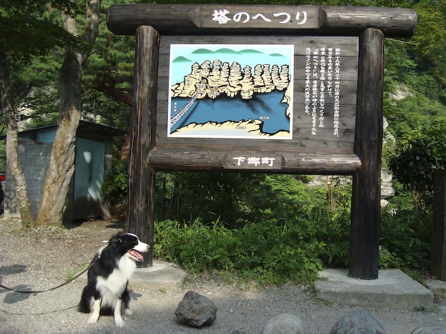 お散歩の後は、朝ごはん♪ ログハウスのオーナーさんから昨日いただいた、 天然酵母石窯パンを頂きました♪ すっごくおいしー♪ 残念、写真を撮るのを忘れました…^_^; さて、腹ごしらえの後は、今日はどこへ行こうかしら? って、全然予定立ててないのよね(^^ゞ みんなで、いろいろ検討した結果(大した検討ではありません) これまで何度も近くまで来たことはあったけど、一度も行ったことのない、 “塔のへつり”へ行ってみることにしました。 “塔のへつり”です。 すごい、吊り橋!! この吊り橋、渡るとすごく揺れるんですよ!おもしろーい! ガスパールは平気で渡ってました。ガスパママも平気です、もちろん!! 渡ると、その先には険しい石の階段が! ここは、ワンコ禁止の文字はないので、 安心して、ガスパールも登って行きます。 「え~、これ登るの~?!」 そーだよー!! 「ふぃ~」頂上に着いて、一休み。 またまた、吊り橋を渡って帰ります。 「ちょ、怖かった…」 ■■■ そのあとも、あちこち回っていろいろお土産を買ったりして、 仙台に帰り着いたのは、かなり夜遅くになってしまいました。 遅い夜ごはんは、我が家でタイコウチ家といっしょに お寿司と焼き鳥と肉まん(?)を頂きました。 もちろん、またまた会津若松で買ってきたお酒「天明」とともに… おいしゅうございました。タイコウチ家のみなさんお世話様でした。 PR