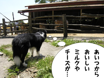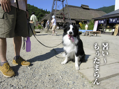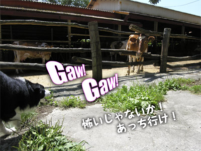 8月。世の中は一斉に夏休み。 日頃は出不精のガスも高原のログハウスへバカンスに! 那須にあるログキャビン彩さんの山荘へお泊まりに出かけました。 ログハウスの夜、ときたら当然バーベキュー! 何者かが虎視眈々と見つめる中 ビールをのんでウハウハのガスパパたち。 翌日はおみやげを買いに「南が丘牧場」へ 夏休み、好天、日曜とあって、すんごい人出。 ガスと牛を見ていたら、 犬に興味をもったのか一頭が近寄ってきた。 食べるのは好きだが、生きているうちはオッカナイらしく、 ガスびびって牛さんにガウガウ。 助っ人うしもやってきた。 おみやげも買ったので 山を越えて江戸時代の宿場町が残る大内宿を目指した。 (地図をよく見てみると道がつながっていなくて結構迂回。←無謀) 犬のお休み処と書いてあった「玉や」さんで昼食、一休み。 イワナのミソ焼きがうまかった。 大内宿は街道の両脇に水路があって 水浴びをして涼をとっているワンコが結構いたが 水がきらいなガスは絶対に入ろうとしない。 恐がりを直せばもうすこし涼しい旅ができたのにな。