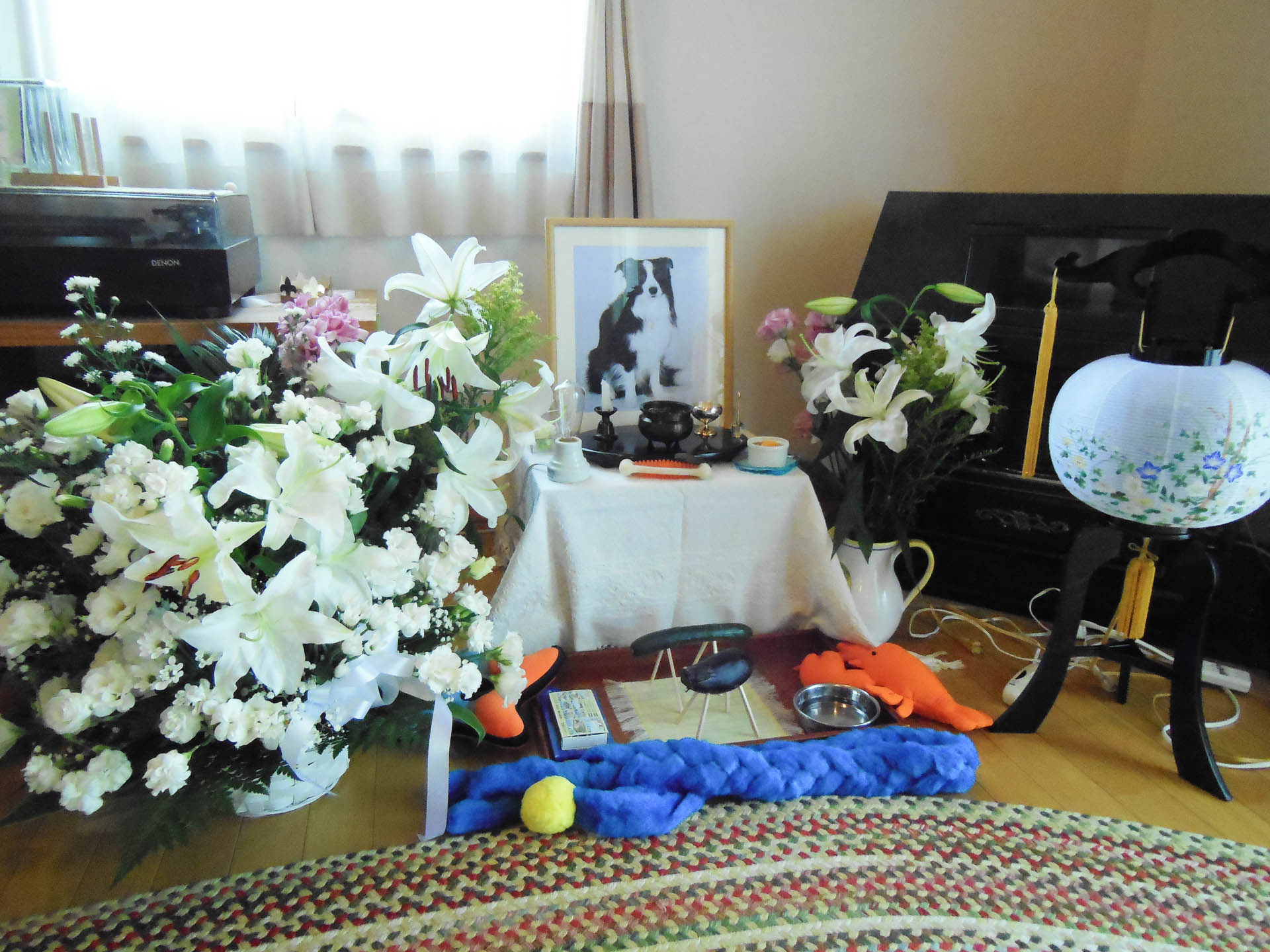 今日はガスパパが朝からお仕事で、4時半に家を出て行きました。 長いのか短いのか、時間の経過、日の過ぎること、曜日の感覚、そういうものがなんだかよくわからないまま、初七日も過ぎて、今日はお家の中にわたしひとりです。 もうすぐお盆、新盆です。帰ってきてね、とお迎えの準備をしようと、昨日は盆提灯を探して仏具屋さんやホームセンターなんかに行きました。あんまりいいのが見つからず、結局ネット購入!7日から11日に届くって。ぎりぎりだね。 何をしたらいいのか何も手につかないので、ボーダーコリーBlogをずっと見ています。 そんな中、2年半前に亡くなったボーダー君のBlogを見つけました。 その方は多頭飼いでもあるんだけど、ずっとずっとその亡くなった仔のことを大切に大切に思い続けていて、お友達もたくさんいて、命日にお花が届いたり、素敵だなと思いました。2年半、、、そんな長い時が経っても、哀しさやさみしさや愛おしさが変わらないんだなと思い、ほっとするような、辛いような複雑な気持ち。 そのBlogの中で、素敵な言葉が紹介されていて、とても心に響きました。 わたしもガスパールBlogに残しておきたいと思います。 愛犬の死をみとるために公演延期をした歌手フィオナ・アップルの言葉です。 (ガスパールのために、彼女を彼に変えました。) 「彼はもうすぐ犬でないものになるでしょう。」 「風の中に、」 「地面に、」 「雪の中に、」 「そして私の中に、私が行く所すべてに存在するようになるでしょう。」