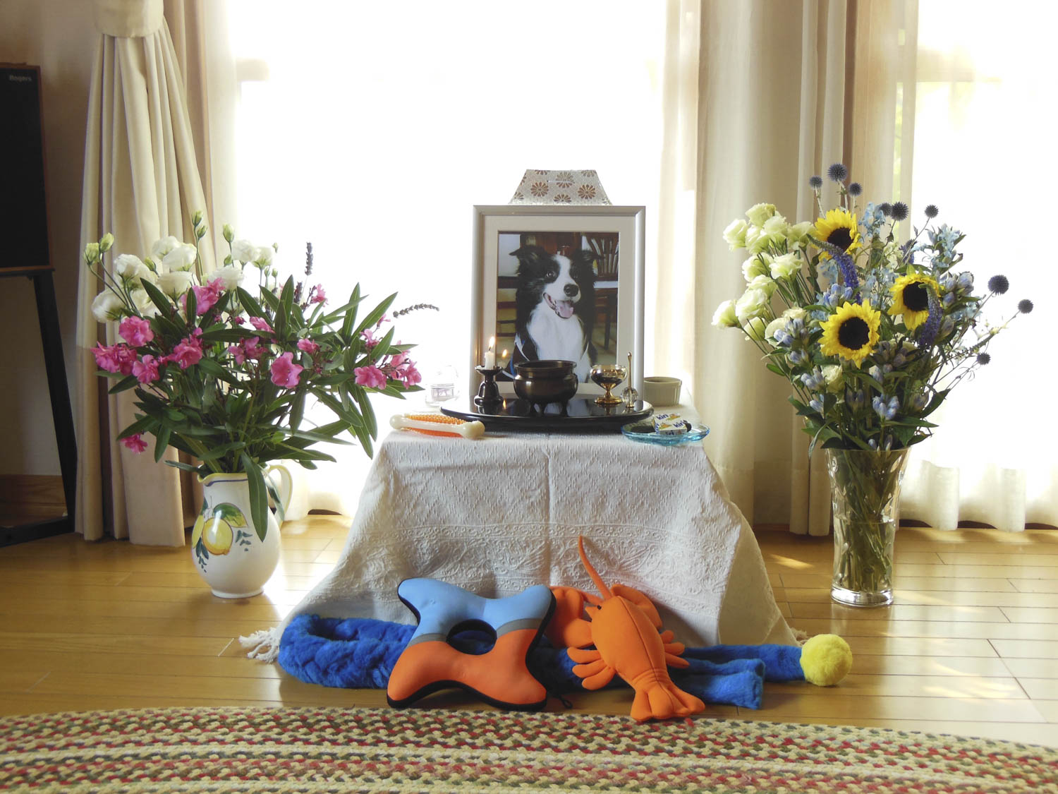 ーガスパママー 本もたくさん買い、サプリメントもたくさん買いました。 なんとかしてガスを助けようと、私達は一生けん命でした。 ガスパパはカッテージチーズを手作りし、 ガスパママはササミジャーキーやレバープティングを作り、 ご飯も抗酸化力のある野菜を細かく切って昆布、干し椎茸、鰹節のおだしで煮たり、 馬刺しをあげたり、鯵ご飯を作ったり。 食欲があって、おいしそうに食べてくれるガスの笑顔が救いでした。 ガスが退院してからは、私達は1Fのリビングに薄い布団を敷き、 ずっと一緒に寝られるようにしました。 なんか、合宿か修学旅行みたいだね、なんて言って。 私達が前向きでリラックスしていないといけないと本で読んだり、 犬は何でも察知するので、ポジティブにと先生に言われたりしていたので、 泣き顔を見せないように努力していました。 でも見られちゃった時は、「何でもないよ!」とか言ってみたり。 手術後、食事療法でガンと戦っていたガス。 ガスパママ特製レバープディング、おいしいぞ! これが最後に見せてくれた笑顔でした。 25日夕方の散歩のあとフラフラと足取りがおかしくなり急変。 動物病院の先生には、次急変がきたら危ないです、と言われていた。 「病院では精一杯処置しますがガスにとって何が一番いいか考えてあげて 病院のベッドよりお家でみんなに看取られたほうが良いかもしれません」 一週間ほど前にもこんなことがあり、立ち直ったので 今度も大丈夫。乗り切ってくれると思っていたのですが… 夕食は受けつけず、ヨーグルトもだめ。 呼吸も荒くなる。 深夜、喉が乾くせいか水を欲しがり、飲ませるも吐き戻す。 4時頃、目が見えないのか辺りをみまわして「キャン」と鳴く その度「ここにいるよ」「いい子だね」と声を掛け、ほほを撫でる。 呼吸、さらに荒くなり苦しそう。 この時には「早く楽にさせてやりたい」と考えるように 何回目かの痙攣の後 「もういいよ、がんばらなくていいよ。」と私達が言うと、 それを待っていたかのように、ガスパパの腕のなかで旅立っていきました。 26日朝、4時30分頃でした。 別れ際、鼻と鼻がぶつかったとき 「じゃあ、もう行くわ。」とガスが言った気がしました。 ぐっすり眠っているよう。今にも起きだしそうです。 26日は通夜として別れを惜しむことにしました。 近所のおばさんや知り合い、チャナ家、虫六家などお別れに来てくれました。 翌27日、大好きだったおやつ、おもちゃ、花束とともに荼毘にふしました。 ーガスパママー 7月5日に病気が発覚してから、わずか二十日あまり。 あまりにも突然のお別れでした。 あれこれ慌てて色々手を尽くしましたが、助けることはできませんでした。 自分の産んだ息子と思って暮らしてきたのに、こんな時輸血することさえ出来ず、 悔しいです。できることなら肝臓だってあげるのに。 今まで全然整理しなかったガスパパがガスの写真のデータを一気に整理して、 一緒に眺めました。 本当に可愛くて賢くてやさしいいい子のガスパール。 いろんなことをしたね。 いろんなところにいっしょに行ったね。 本当に楽しかった。しあわせだったよ。 これまで一緒にいてくれて本当にありがとう。 天国でしあわせに暮らしてね。 そして、また逢おうね。 9歳と5ヶ月。 もっともっと長生きしてもらいたかったけど。 きっとガスパールは天国からきた天使だったので 故郷に帰ることにしたんです。 おいしいもので繋ぎ止めようとしてもダメでした。 皆様の所の天使たちが末永く健康でいられますように! PR