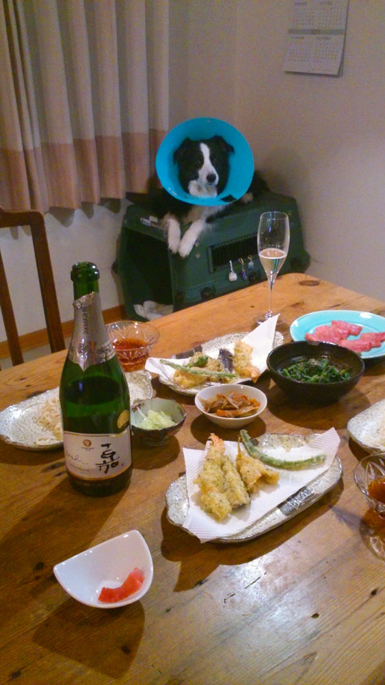 みなさま、新年あけましておめでとうございます!! 昨年のクリスマスに去勢手術に踏み切ったため (前立腺炎がひどくなってきたため思い切りました。) エリマキ・ボーダーコリーのガスパールなのです。 正月休みをカラー付きで過ごさなくてはならなくなったけど 本人は全然気にしてない様子。 基本鈍感犬なのです。 新年一発目の「酒とガスパール」は 最近我が家でブームの国産ワインから、 高畠シャルドネ・スパークリング「嘉」です。 そば、まぐろ(三陸ひがしもの)、天ぷらに合う一本。 本場のシャルドネにも引けをとらない美味しさ。 ちなみに手前の一切れはガス用で〜す。