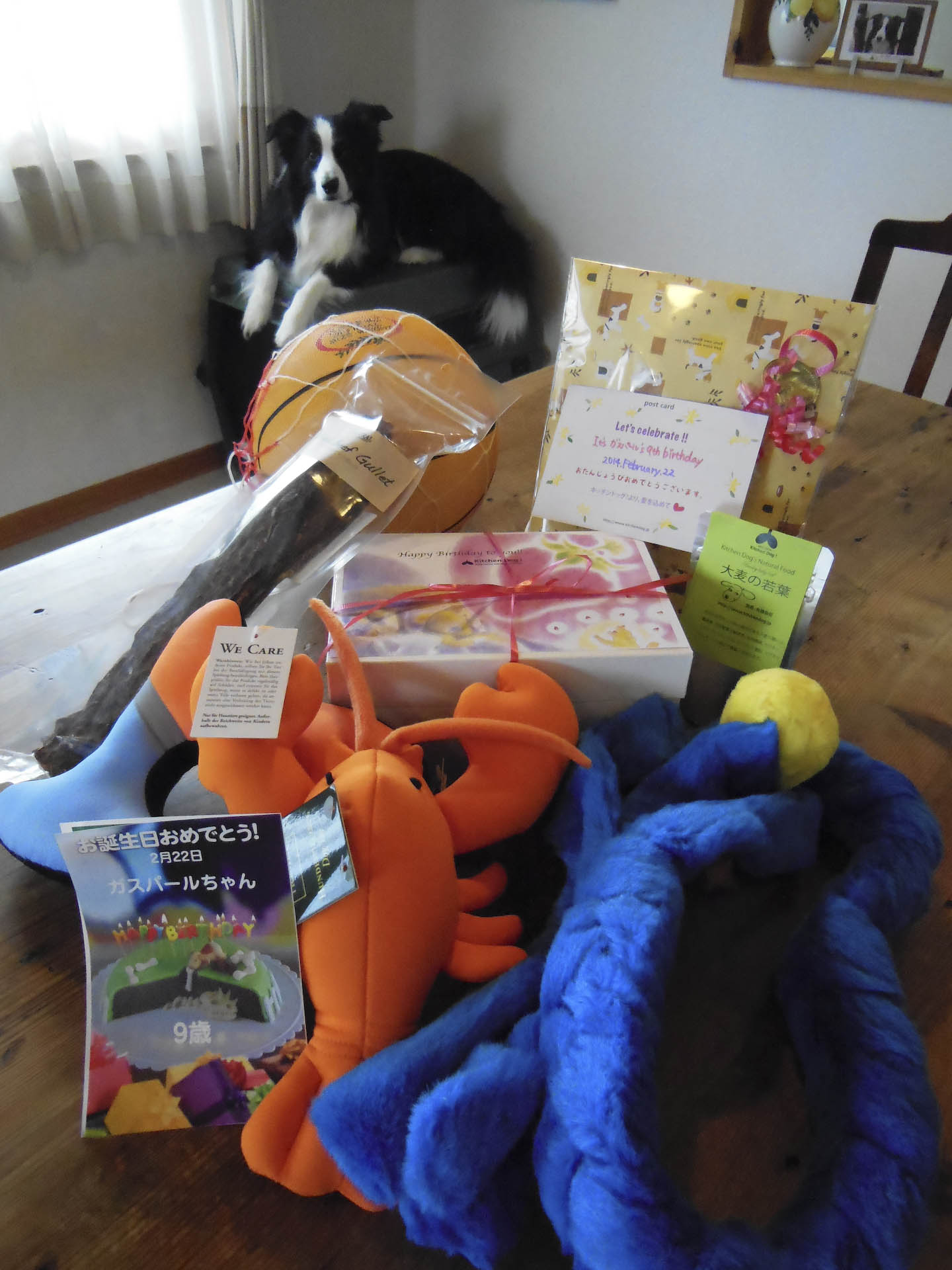 2月22日今日はガスパール王子のお誕生日♪♪♪ 一年の中で最も盛大にお祝いをする日です。(我が家的に) 本日の主賓は朝からシャンプー、ブロウ、ブラッシングという 迷惑な一日のスタートを迎え、さらに夕方のお散歩の後、 いつもならすぐに晩ごはんが出てくるのに、今日はなかなか出てこない! 忘れてるんじゃないの?! やっとそれらしきものが出てきたと思ったら、 はらぺこなのに、写真なんか撮られる始末。 (口元がちょっと曲がってるのはそんな気持ちの表れです。) というわけで、早いもので、ガスも9歳になりました! 人間で言ったら58歳くらいになるようです(ソースはここ) これからもいっそう健康に気をつけて、長生きしてもらわなきゃ。 キッチンドッグさんのモンデリ(馬肉バージョン)でお祝いです❤ ガスパール王子の生誕を祝って世界中から寄せられた、プレゼントの品々。 チャナ家のみなさま、虫六家のみなさま、素敵な贈り物をありがとうです♪ やったね、ガス! ガスパール王子の生誕を祝して、宴会に興じる臣民たち。 めでたい、めでたい。 ☆宴席のメニュー(人用)☆ 鶏もも肉のレモン風味ロブション風 卵とじゃがいものサラダ ライスサラダ カプレーゼ 自家製ローストビーフ 長いパン(コネルベーカリー)by虫六家 三元豚のレバーペースト by虫六家 イタリア白ワイン(M屋)by虫六家 フランス赤ワイン(Gマート) 高畠赤ワイン(Gマート) パスティス PR